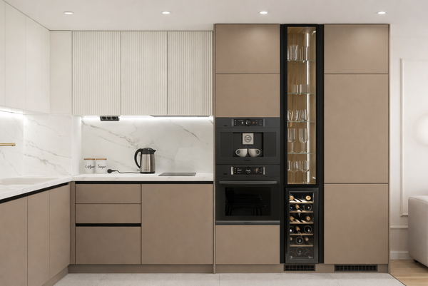 This compact luxury kitchen design combines minimalism with high-end finishes. The sleek beige cabinetry, complemented by a marble backsplash, offers a refined aesthetic. The tall unit featuring a wine rack and integrated appliances adds both functionality and style. The thoughtful layout maximizes space while maintaining a clean, organized, and sophisticated look, making it ideal for modern homes where elegance meets practicality.