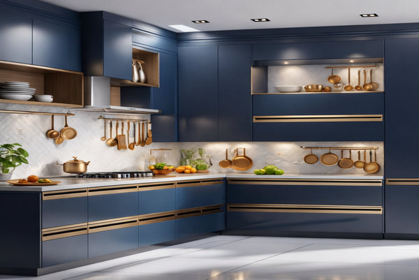 Design Layout: Incorporate open shelving and sleek drawers with brass/gold handles for an upscale look, ensuring easy access to kitchen tools.